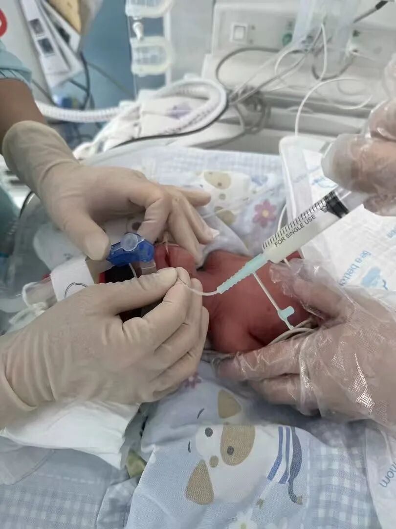 与此同时,另外两名32周和33周的早产儿也接受了针对性救治。对于32周的宝宝,团队重点进行呼吸支持和神经保护;33周的宝宝则侧重于感染控制和营养支持。每个孩子的救治方案都根据具体情况“个案化”制定,这背后是新生儿科五年多来累计救治700余例早产儿积累的经验和流程。